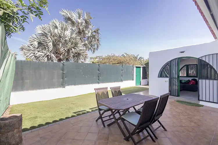 Confortable bungalow independiente totalmente equipado con gran terraza privada y piscina comunitaria, situado en un lugar privilegiado de Maspalomas. La propiedad consta de dos dormitorios, uno con cama de matrimonio y el segundo con dos camas individuales. Baño con bañera y salón cocina completamente equipado. A destacar el la gran terraza privada con comedor exterior al aire libre.