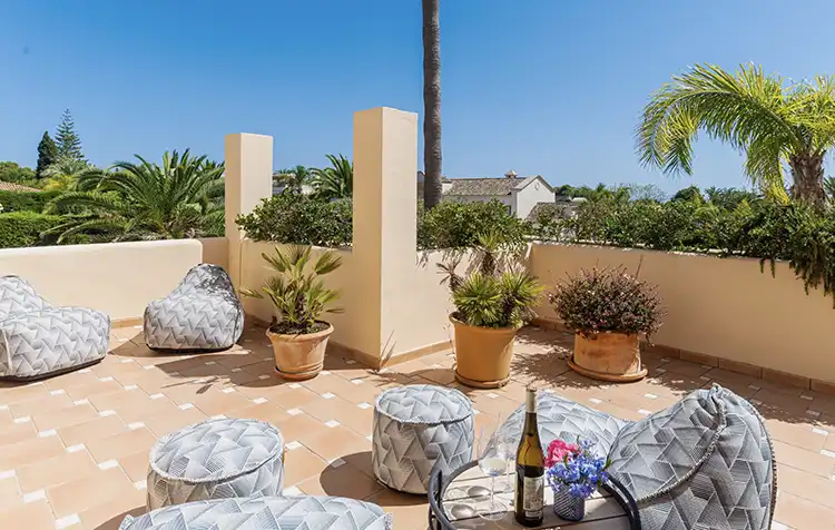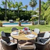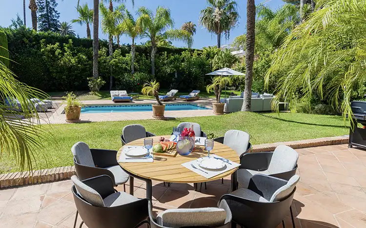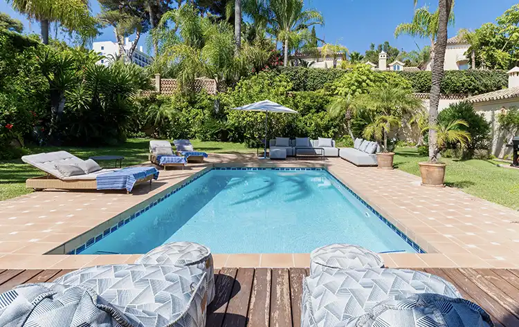 El extenso jardín incluye una gran piscina con tres tumbonas, ofreciendo espacio para cuatro personas, así como un sofá exterior y dos pequeños pufs. Esta villa en Los Monteros es el epítome del encanto andaluz, ofreciendo confort, elegancia y una ubicación inmejorable. PISCINA CLIMATIZADA: Cargo adicional de 350 euros por semana entre el 1 de octubre y el 31 de mayo.